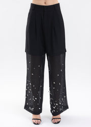 Black cropped trouser in black. Constructed from a gabardine wool blend with silk lining. Features contrast piping at outseam. Front pleat detailing. Zipper closures at hem with contrast silk detailing. Button fly closures. Finished off with an elastic cuff.