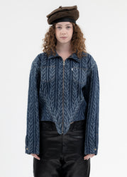 Oversized long sleeve denim jacket constructed from a stonewashed grey denim. Features an extended body length with a classic button-down closing, enlarged chest pocket details, side hand pockets, and side hem adjustable fasteners. The dropped shoulder area of the garment is constructed with large panel that builds into the sleeve that can be worn in numerous ways, hidden behind or overtop the front, creating a larger than life layered silhouette.