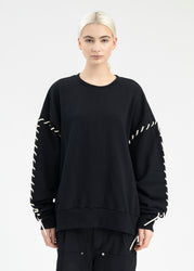 Charcoal grey relaxed fit crewneck sweatshirt. Features multicoloured logo prints in varied typographies across the front face. Paneled construction with dropped shoulders. Finished with a flat hem and tonal stitching throughout.